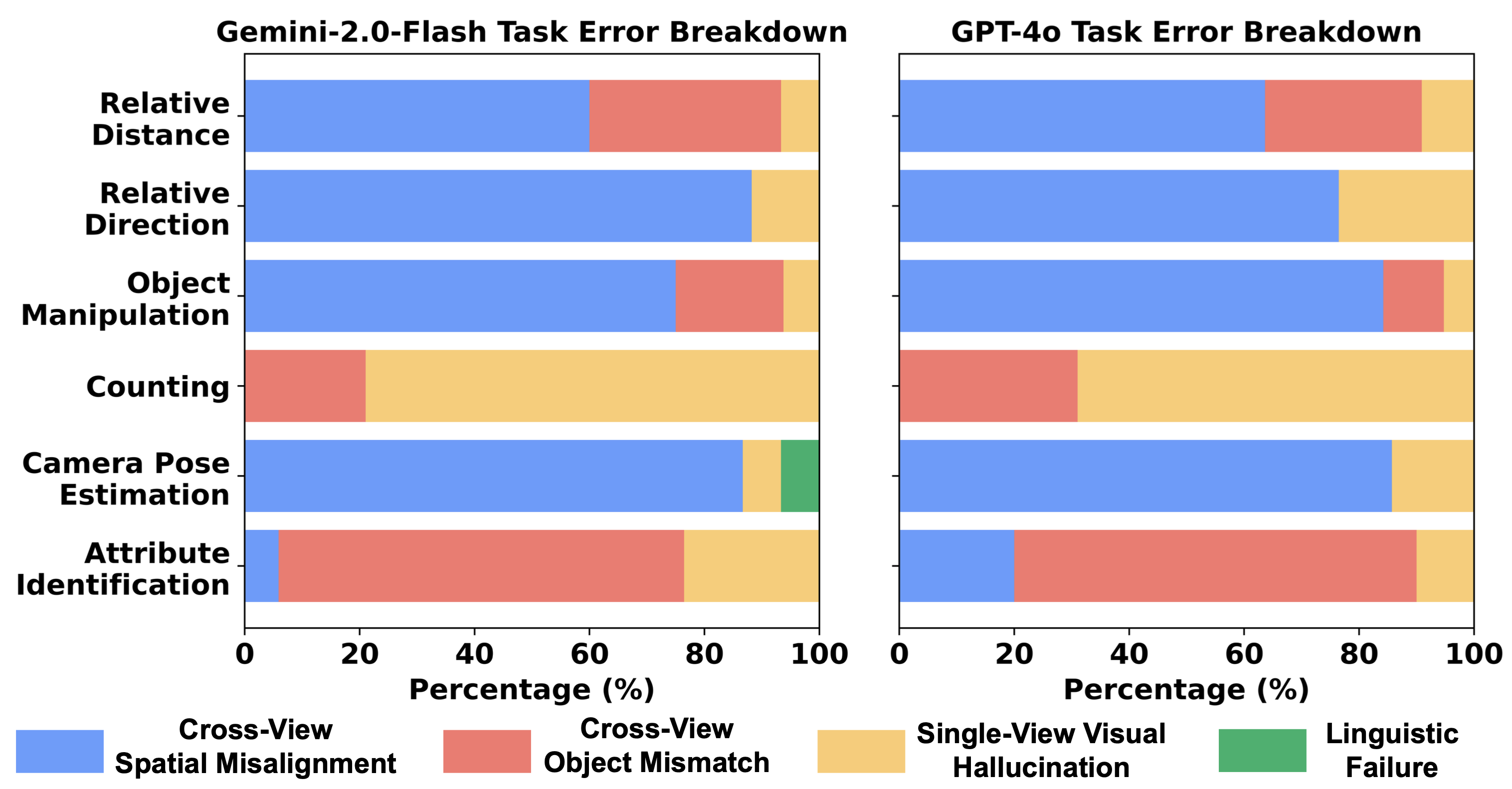 often failing to align viewpoints or interpret geometric relationships, highlighting a significant gap from human-level reasoning.